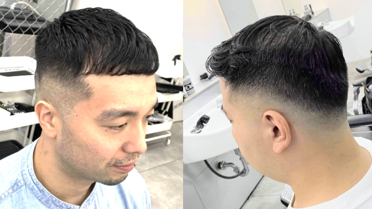 フェードカットのグラデーション技術を応用し、薄い部分(頭皮が見えている部分)と濃い部分の色味の差が、写真のように均一に見えるよう、緻密に刈り込みます。